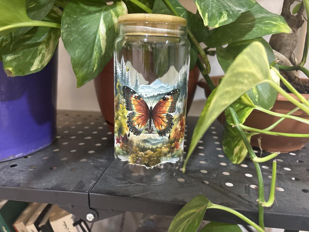 • مج الايس كوفى بتصميم جذاب يدمج بين الفراشة الطبيعية وخلفية الأشجار، مما يضفي لمسة فنية على كل رشفة