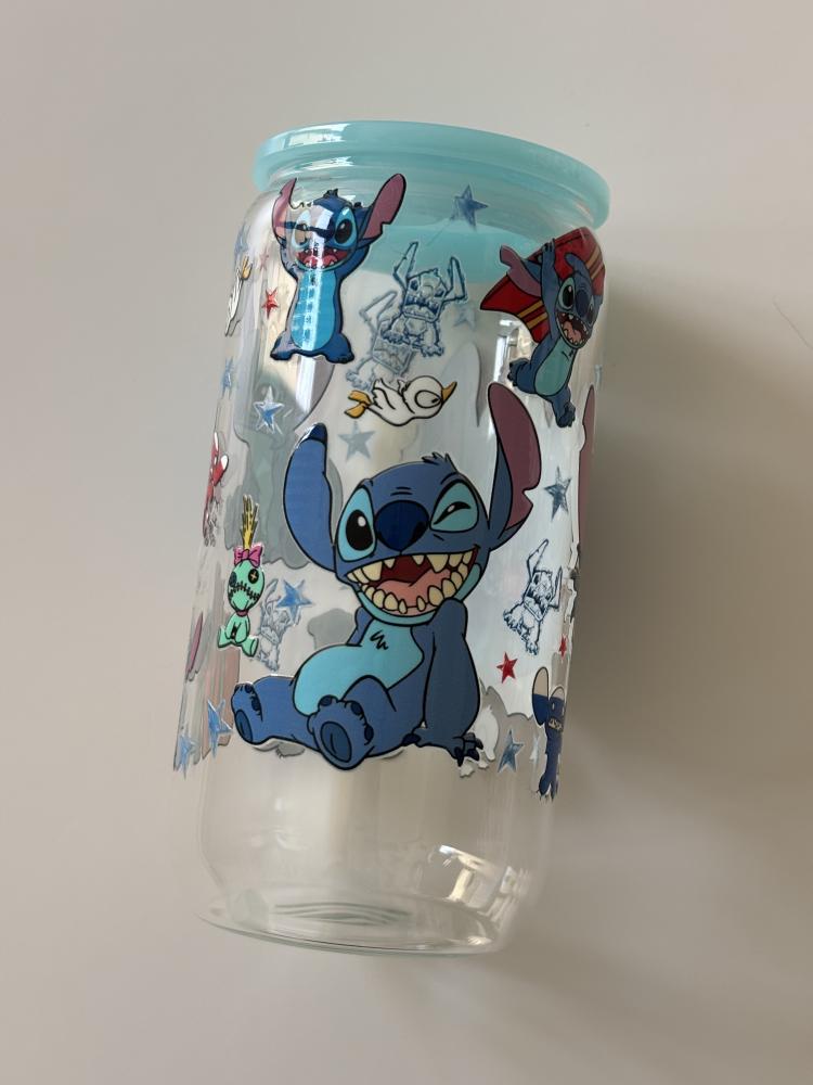 كوب ستيتش يجمع بين الشفافية والألوان الزاهية، مع غطاء سماوي ورسومات شخصية ستيتش الزرقاء، ليمنح كل رشفة لمسة من المرح والحيوية