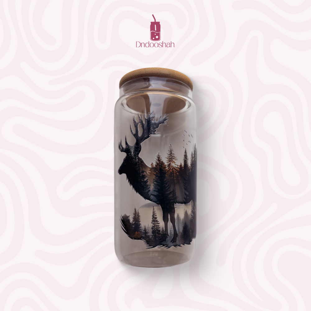 اكتشف كوباية بشاليموه زجاج، تحفة فنية صغيرة تضيف لمسة من الجمال والهدوء إلى لحظاتكم اليومية. يتميز تصميمه برسمة غزالة متداخلة مع غابة بتدرجات الأسود والرمادي والأصفر